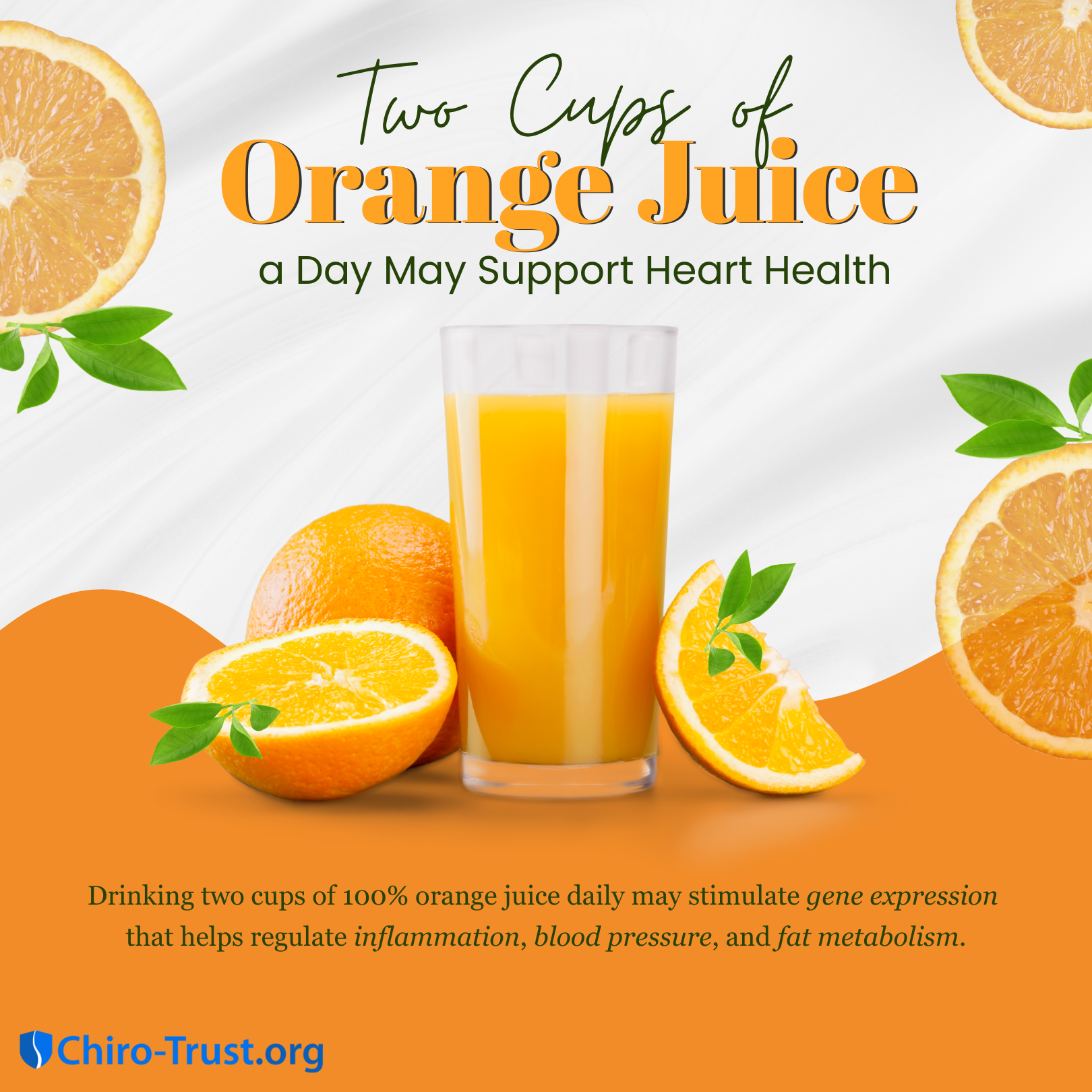 In a recent experiment, researchers observed that drinking two cups of 100% orange juice a day stimulated expression of genes that help regulate inflammation, blood pressure, and fat metabolism—all of which benefit heart health.